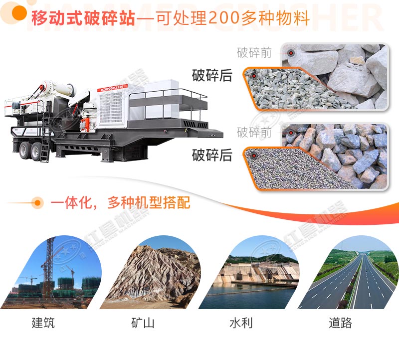 作為40多年的大品牌破碎機生產廠家,紅星機器為您提供的移動破碎機不但種類多、型號全、性能佳、價格優,而且還兼具節能環保效果,并可免費為您量身定制設備。